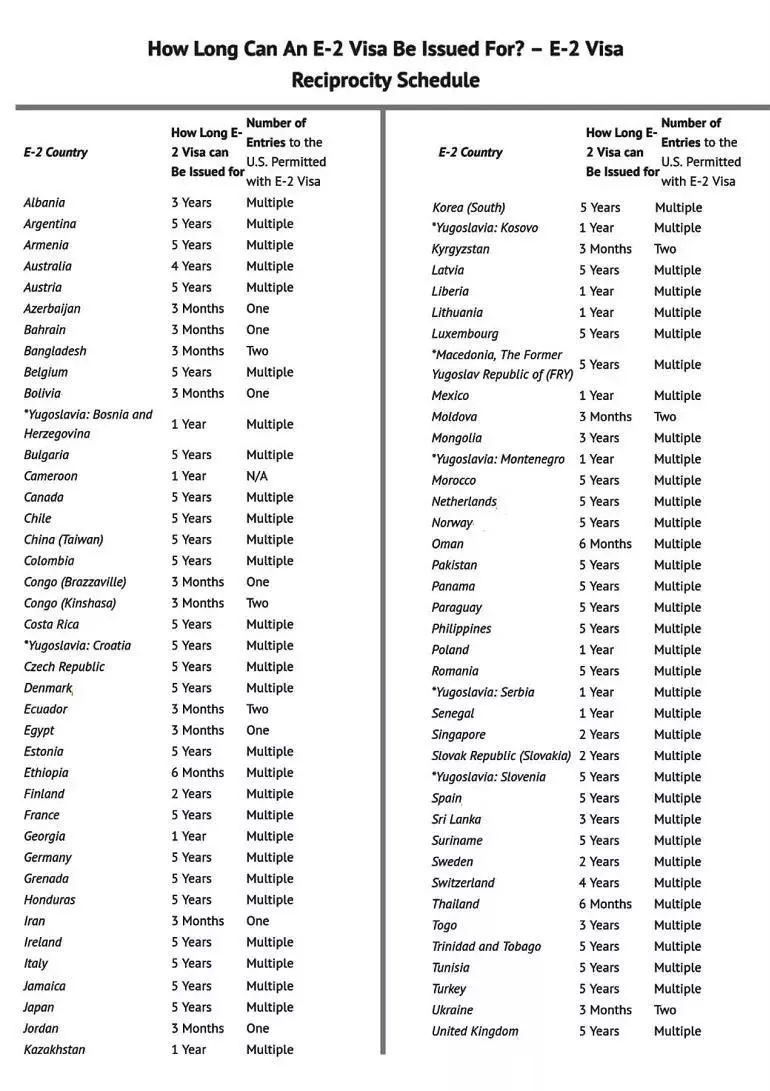 下表取自美國移民局網站,其通商及通航條約國之E-2期限及其投資人可往返次數。